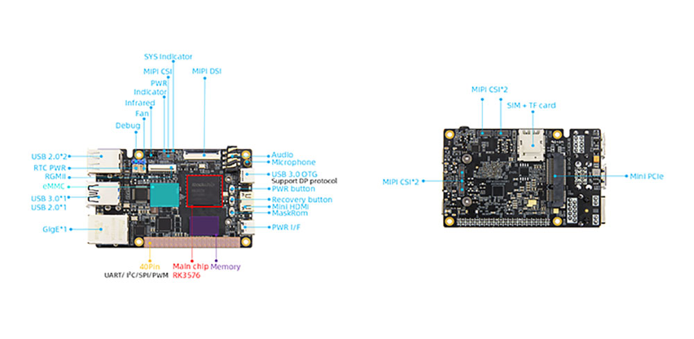 4. Port Ethernet Gigabit à bord, RGMII, USB3.0 / 2.0, Mini PCLE, Mini HDMI, écran MIPI et appareil photo MIPI et autres interfaces périphériques, conduisant des épingles inutilisées de 40pins, des interfaces d'extension riches pour répondre à plus de besoins de développement!
